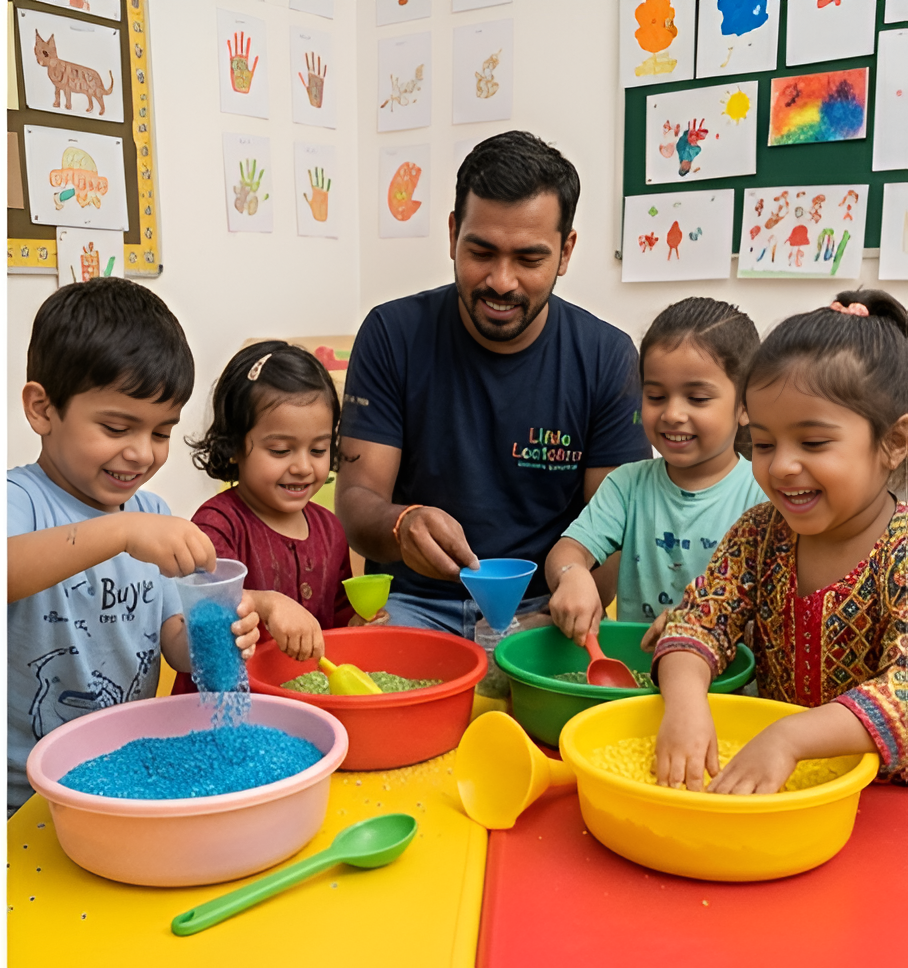 Sand pit, ball pool, and tactile activities that develop fine and gross motor skills while sparking curiosity and sensory awareness in toddlers.